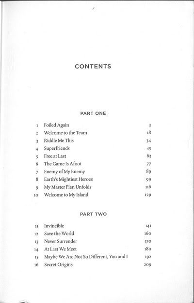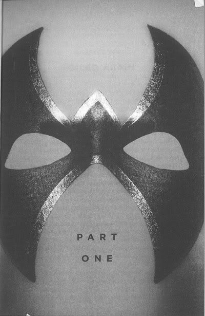 The title spread and part title pages contain more superhero iconography (masks; the Part 3 title page, not pictured, contains an image of a gauntleted fist.) They are just plain striking.