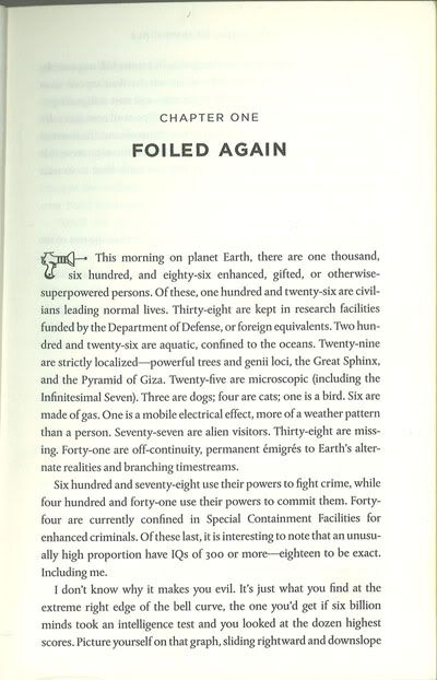 Once more chapter headings are in a nice sans-serif font while text is serifed – These very much resemble standard Penguin fonts. Particular attention should be drawn to the pictograms of a ray-gun and an eye that sit where one would generally expect to see a drop-cap. This is a simple visual representation of the book flipping between its two narrators – the raygun represents Doctor Impossible, the eye Fatale.