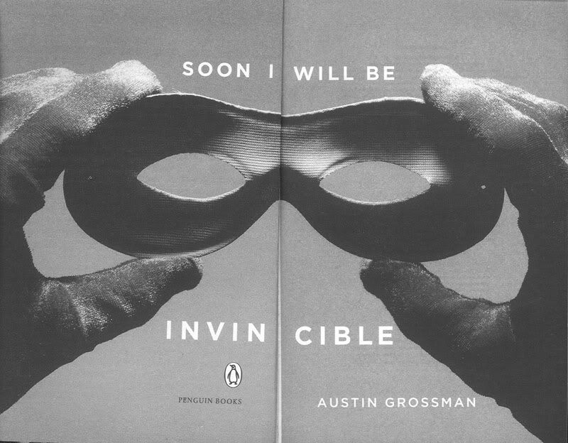 Austin Grossman. Soon I Will Be Invincible. Penguin, 2008, UK edition. Cover design by Estuary English. Illustration by Bryan Hitch. (NB: internal design may be Chip Kidd. The internal design is the same in US and UK editions and Kidd designed the 2007 US edition.) Collected 29 March 2010